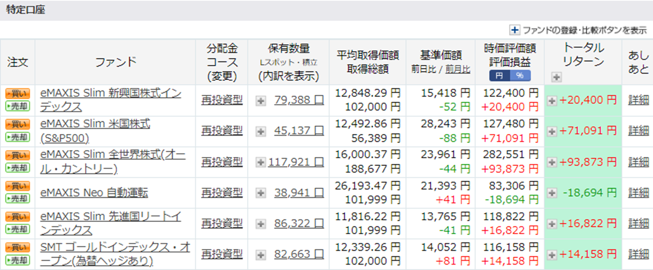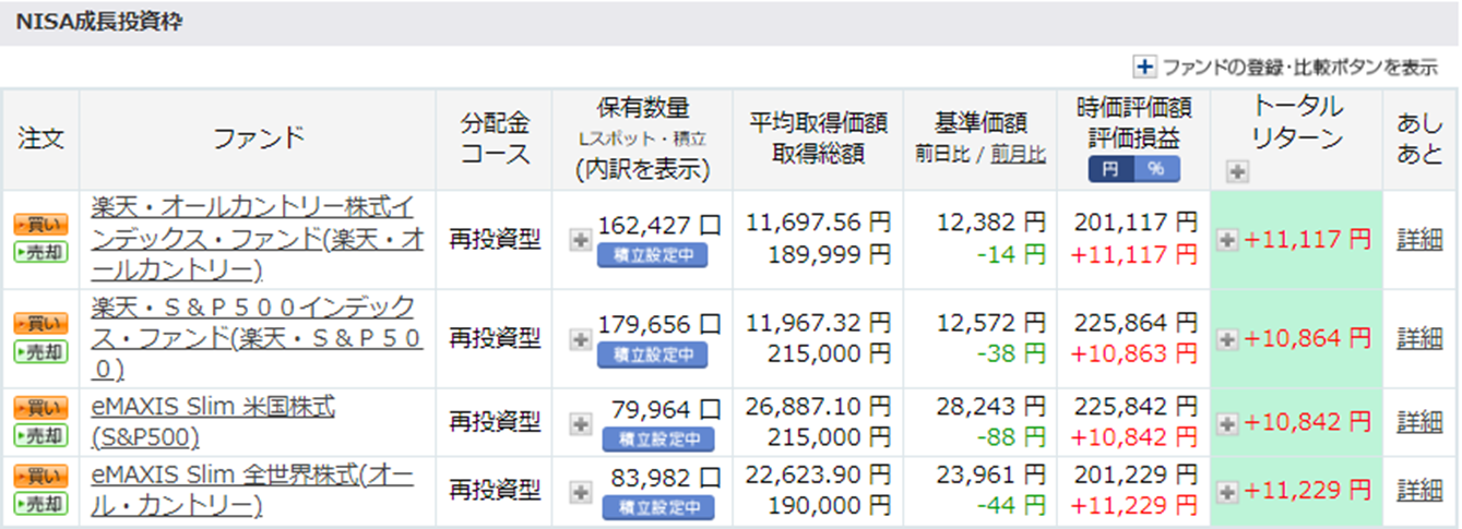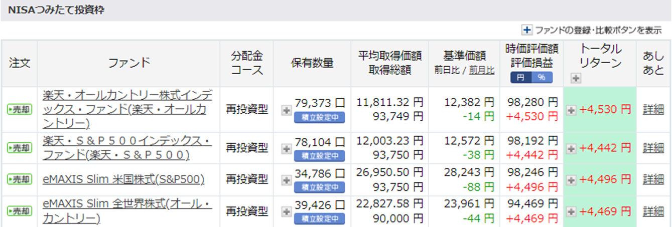 つみたて投資枠では、eMAXIS Slimのオルカンのみ積立額が少ない状況ですが、こちらは両方のオールカントリの積立額が少ない…。(4銘柄それぞれ同じ金額積み立てているのに…。)