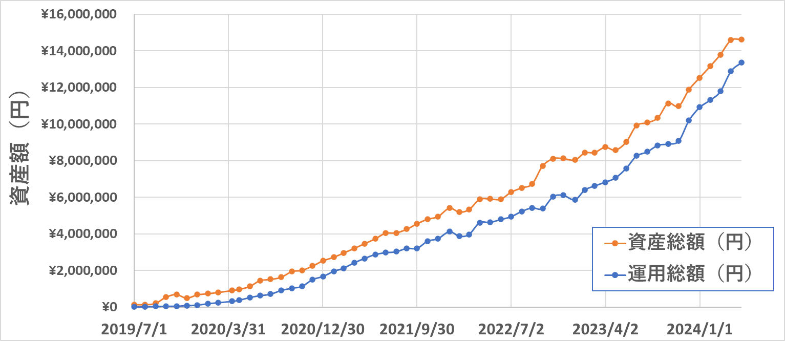 この半年ほどは、総資産・運用資産ともに一気に上昇していましたが、先月は上昇も一休み。