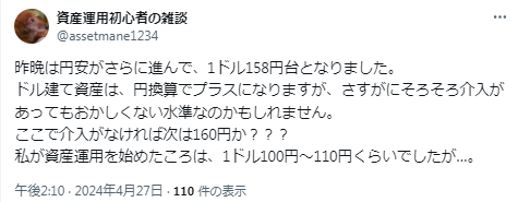 私は、FXには興味がありませんので介入についても全く問題ありませんが、今後ドル円がどうなっていくのかというのは、ドル建て資産が8割以上となっている私にとって、多少の注目点ではありますね。