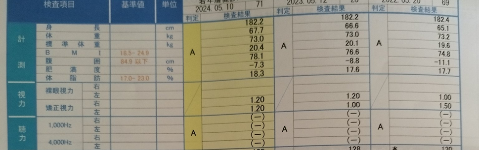 左から、2024年、2023年、2022年と3年分の結果を比較できます。計測については、特に問題なさそうです。肥満度はマイナス10%以上と、身長の割には体重が少ない状況が続いていたところでしたが、31歳の年ということで少しずつ筋肉をつけられれば、とも思っています。(少し筋肉質に近づいたようにも思います。)