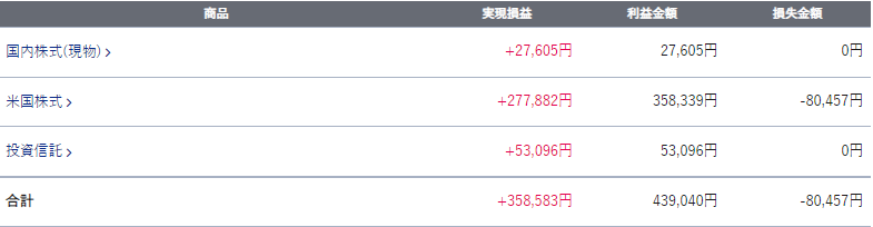 基本的に売ることがないということで、実現損益はそれほどないだろうと思っていましたが、SBI証券についてSOXLをギャンブル枠として売買をしていたということで、35万円のプラスとなっていました。