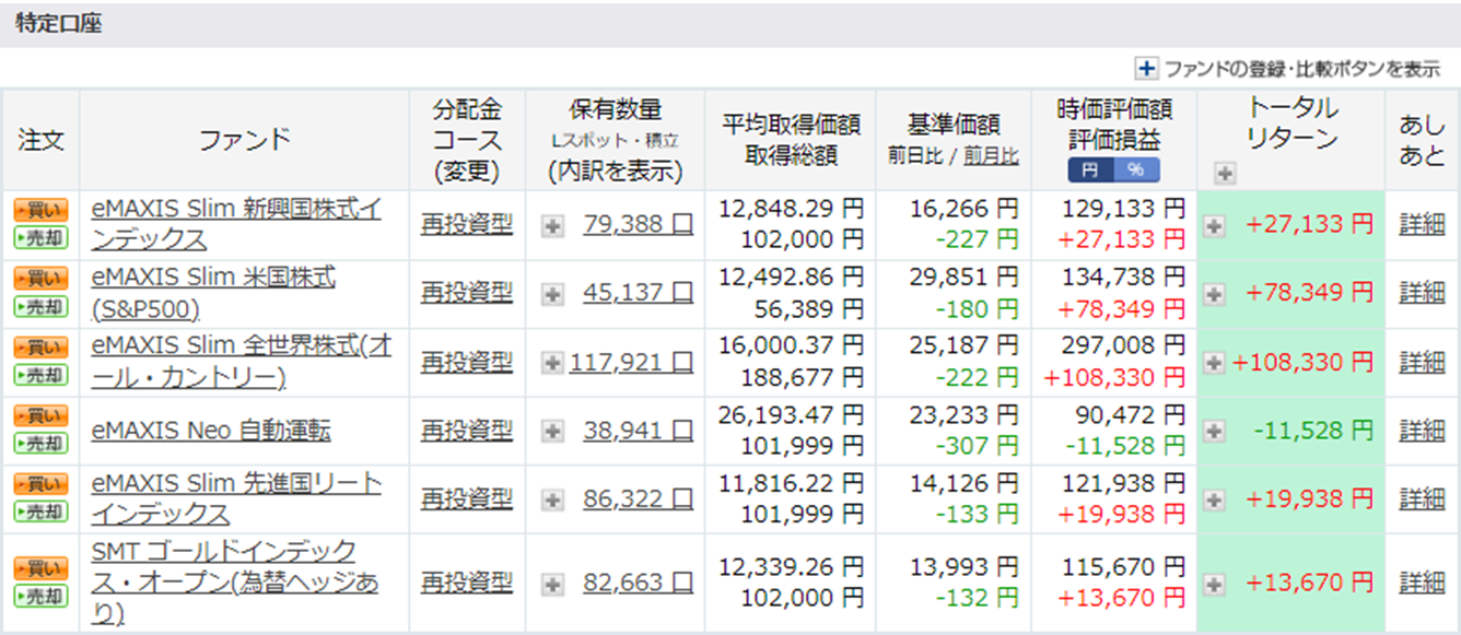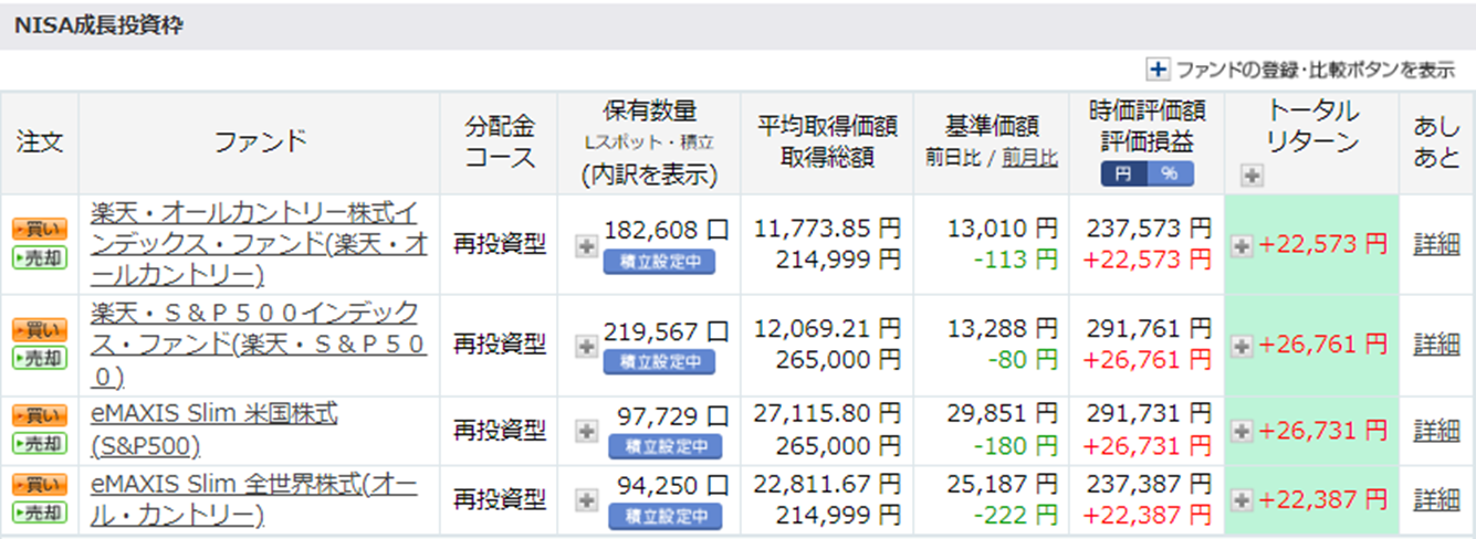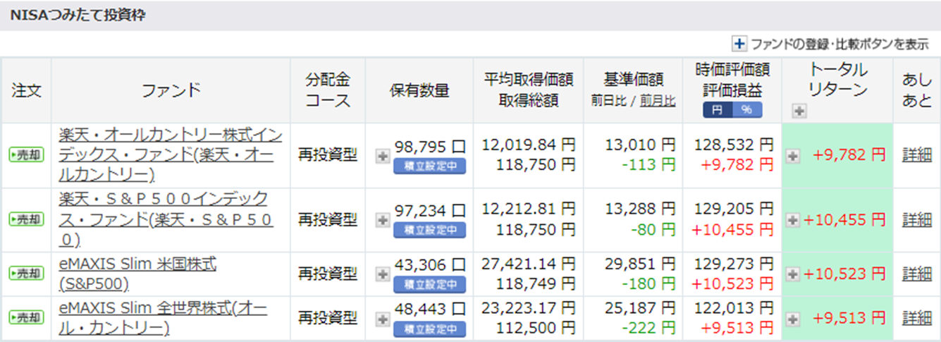 つみたて投資枠では、eMAXIS Slimのオルカンのみ積立額が少ない状況ですが、こちらは両方のオールカントリの積立額が少ない…。(4銘柄それぞれ同じ金額積み立てているのに…。)