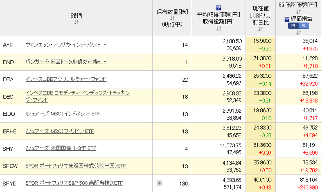 楽天証券の米国株のほとんどはSPYDです。(あくまで配当目当てですが。)含み益も出る上に、さらに配当もあれば気持ち的にはかなり安心です。私が運用している中で一番愛着があり、頑張ってほしいのがSPYDです。ETFの中で一番最初に購入を始めたものでもあります。