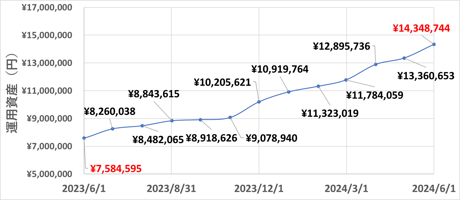 先月初旬と比較して、トータルリターンが+17.0万円となりました!             (5月:¥1,316,000 → 6月:¥1,486,000)