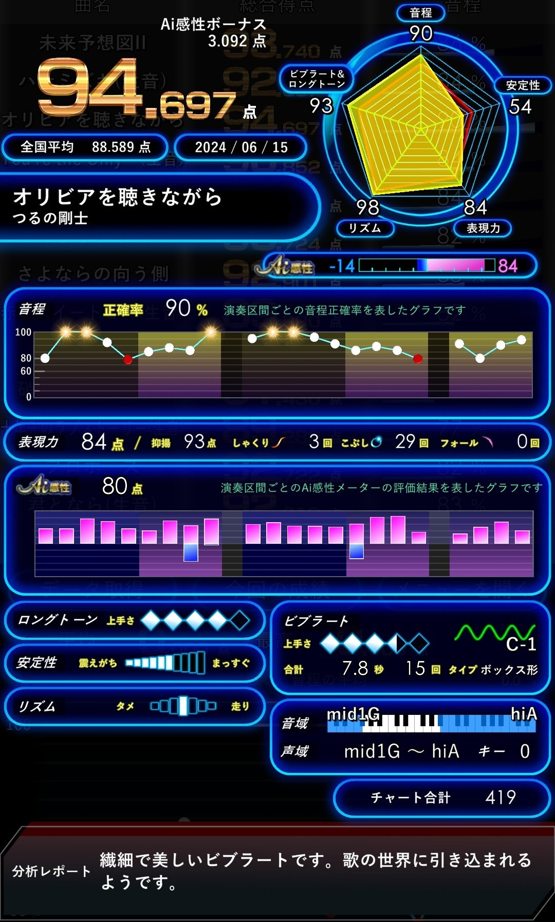 課題は、安定性、音程、ビブラート&ロングトーンあたりかなと思っています。特にほとんどの場合、安定性が平均と比較してもかなり低いので、改善できればと思っているところです。