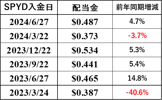 SPYDは、2023年3月配当は前年同期比-40%でしたが、ここ6四半期で4四半期の増配と調子がよさそうで以前に比べれば安定してきたかなと思います。100株を超えてきましたので、3か月に1回まとまった金額をいただけるようになってきました。
