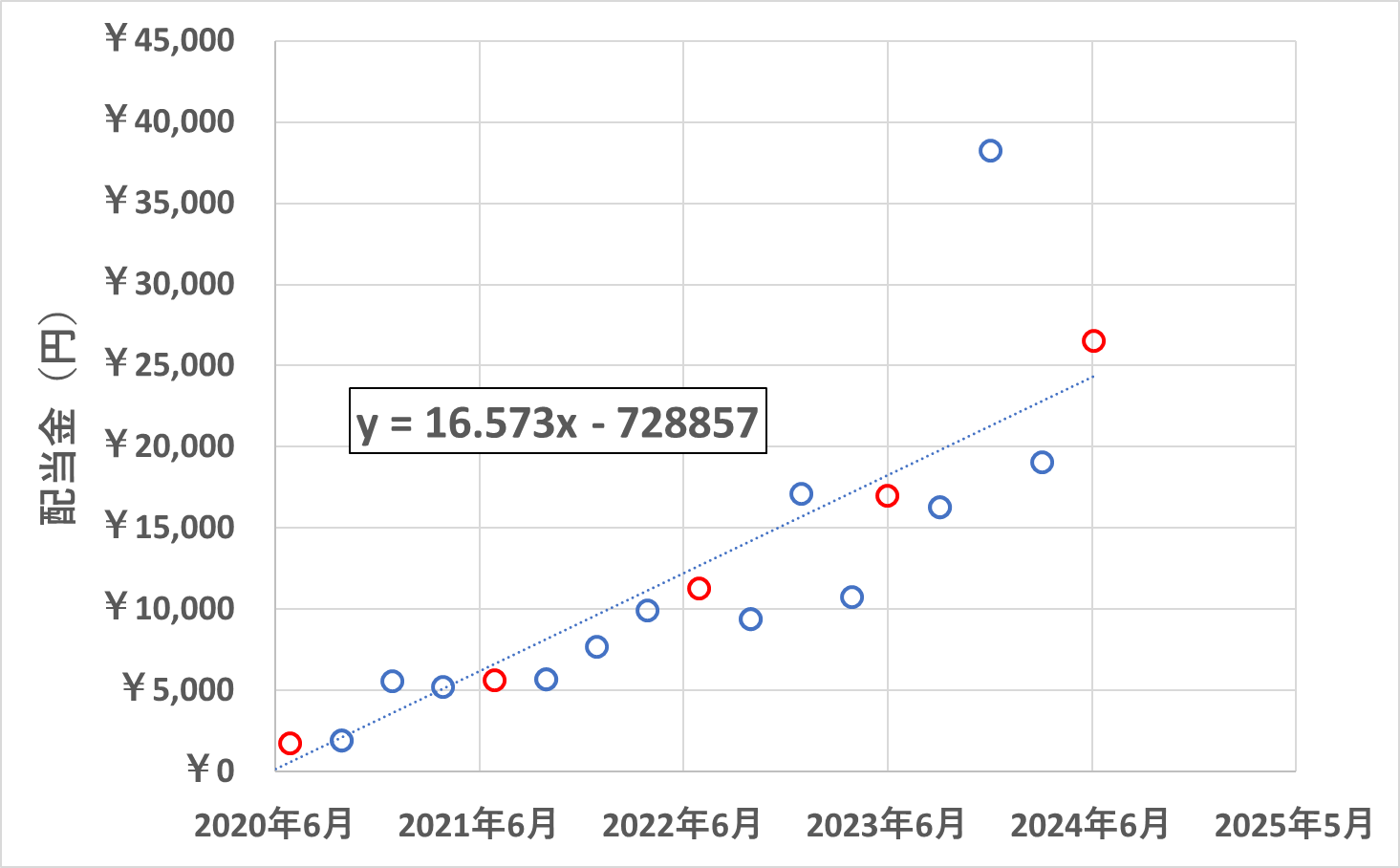 今回の配当ですが、日本円換算で過去最高だった前回から半減ということでした。(今回は1ドル160円で計算しています。)