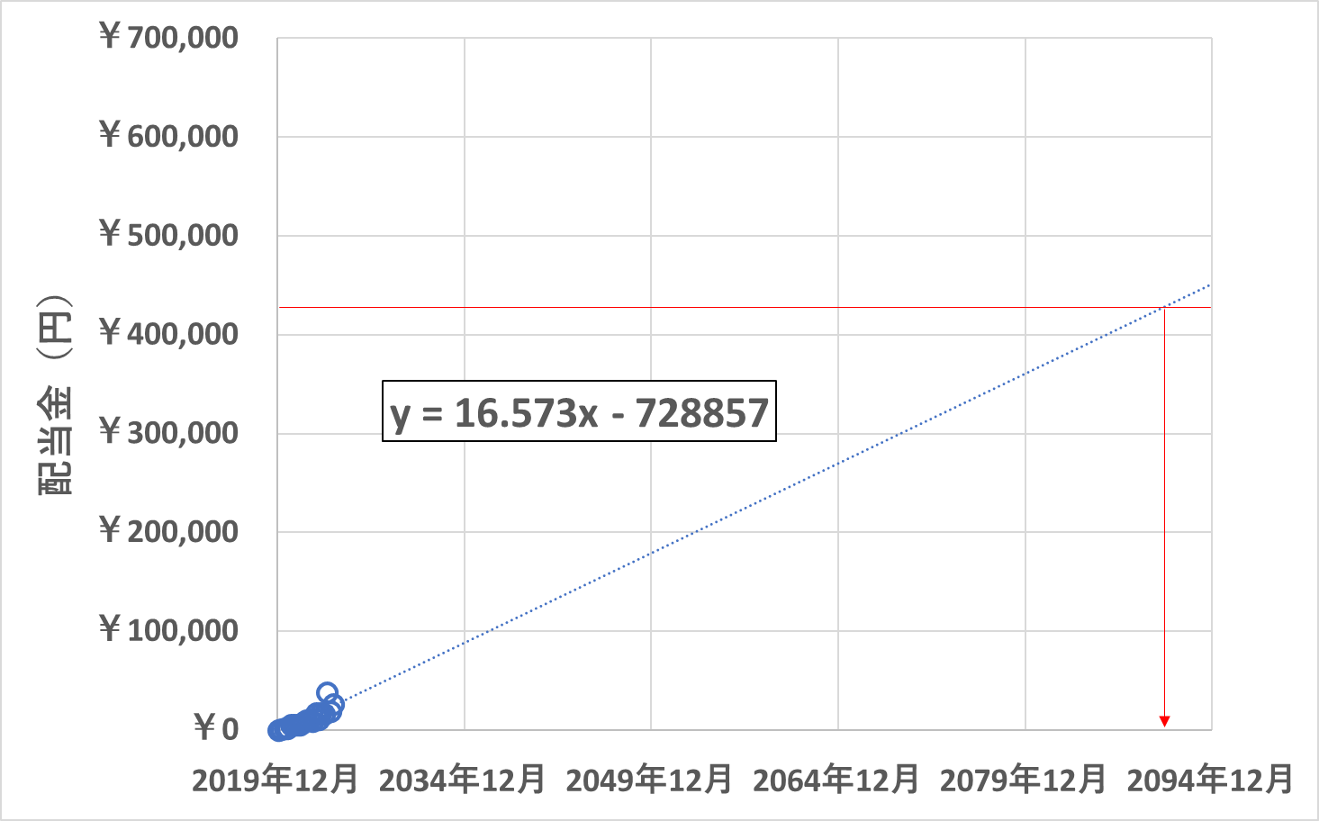 このペースで配当が増えていくと、いつになったら達成できるのか計算してみることにしました。