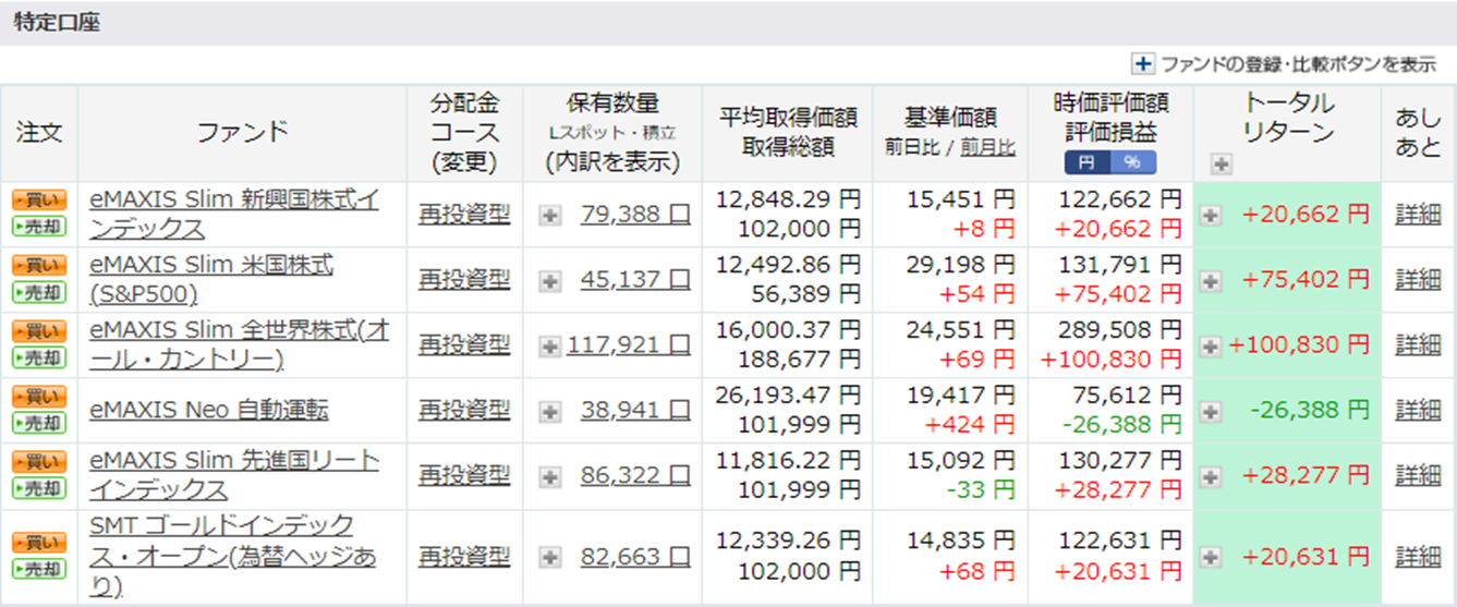 こちらもトータルリターンは下落ということで、久々に買い増しをするチャンスともいえるのですが、つみたて投資枠は1日5,000円と固定です。ただし、ファンド休日等で積み立てできていない部分はこのタイミングで動いても良いのかもしれません。