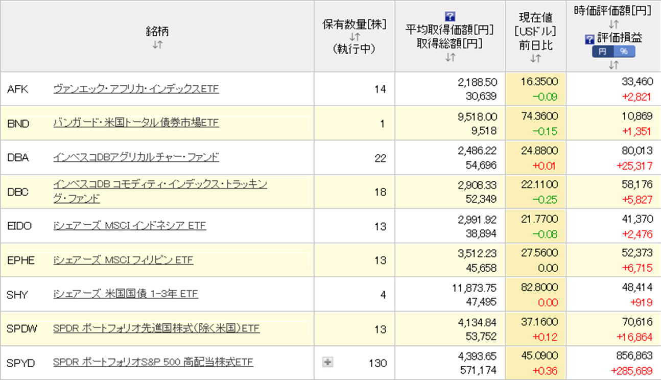 こちらは、円高の分は下落ということになりましたが、SPYDを中心に前月から上昇ということになりました。SPYDも待ちに待った最高値更新!しっかりと価格上昇をして、かつ配当もいただけるということになればありがたいことです。