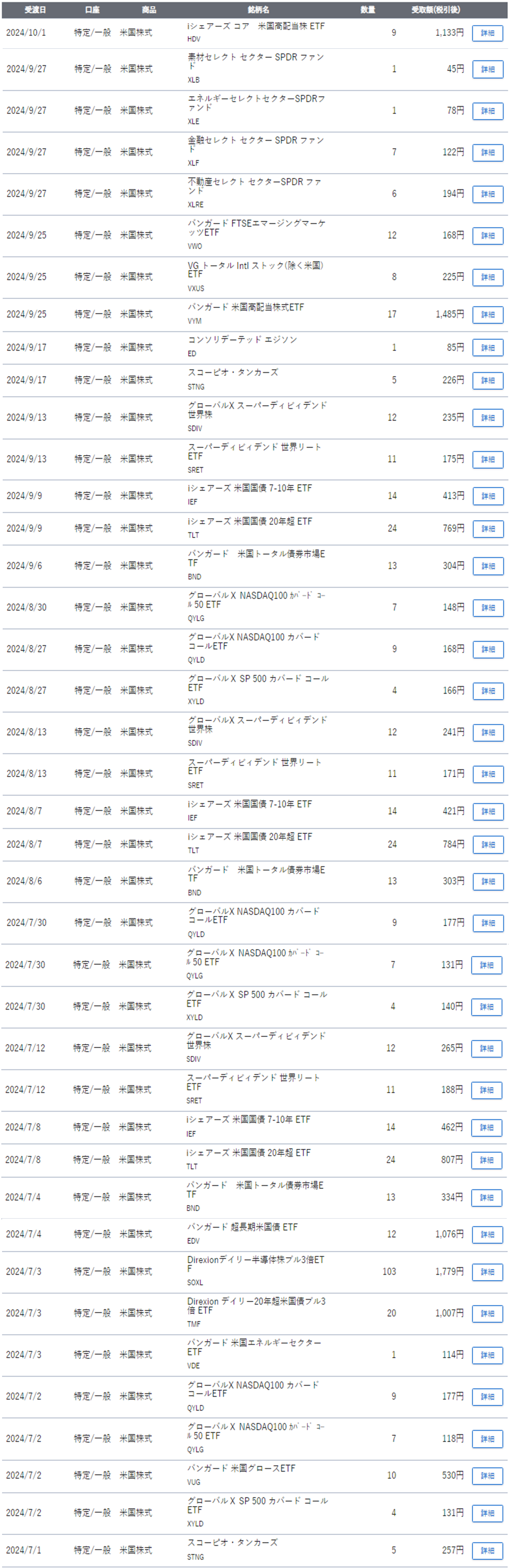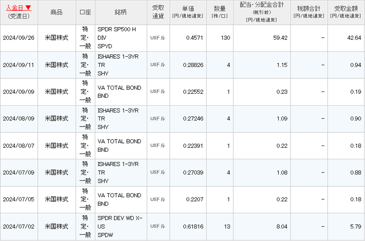 図2 各配当金(2024/7/1以降、SBI証券・米国株)