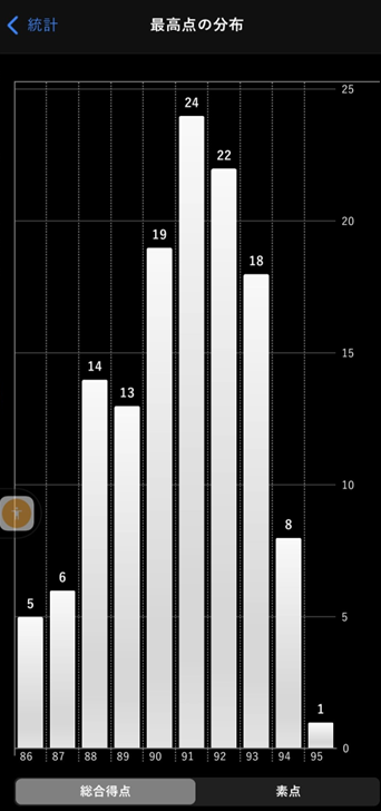 最高点の分布も確認してみました。これまでは、94点台がMaxということでしたが、今回95点台が出たことで右端に95点台として「1」が記録されました。いつの間にか、94点台も8曲まで増えました。