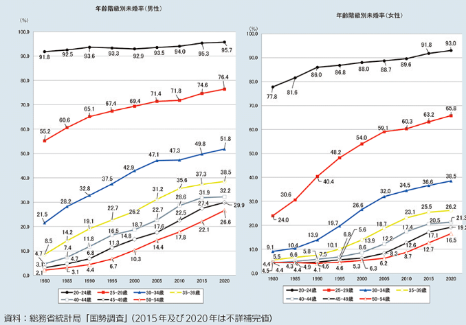 図 厚労省 令和5年度版 厚生労働白書 図表1-1-9 年齢階級別未婚割合の推移より