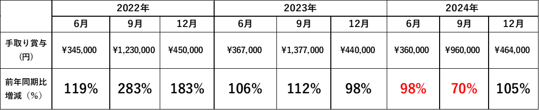 前回の9月賞与と比較すると大幅減少となりましたが、前年同期比で約3万円の上昇でしたね。(少しでも上昇したということで良かったです。)