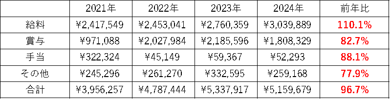 表2 2021年~2024年の収入比較
