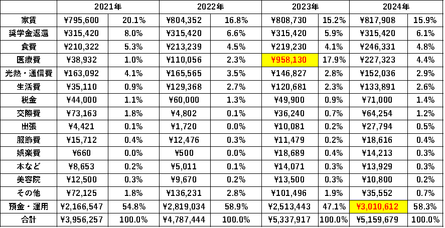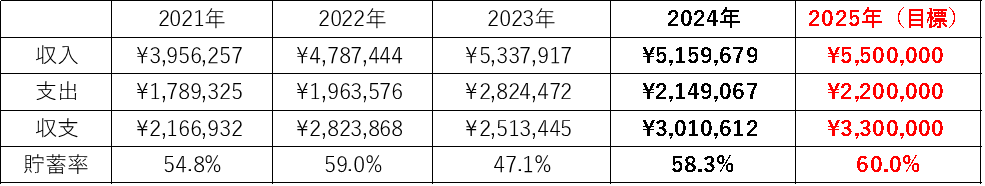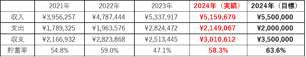 2024年ですが、一転してV字回復で貯蓄率50%台後半と初の単年家計収支300万円を突破することができました。