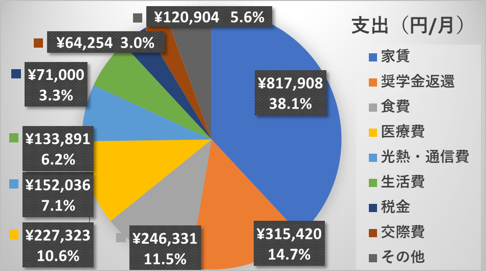 ということで、支出の合計は2,149,017円でした。昨年から20%以上減少しましたが、2年連続に年間200万円以上となりました。月平均に換算すると約17.9万円(うち奨学金返還が2.6万円)をということになりました。