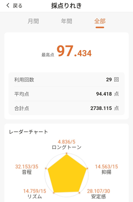 今のところですが、LIVEDAM Ai 精密採点AIでコツコツと採点をして、徐々に点数が上がってきたということで、引き続きこれで練習をしていき目指せ100点ということでやっていきたいと個人的には思っています。