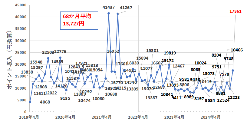 というわけで、2019年5月(月途中から始めたため参考データ)、2020年4月、2023年5~11月2024年2月、3月、5月、7月、9月、11月以外の計51か月間において、月間10,000円分以上のポイント獲得を達成しています。