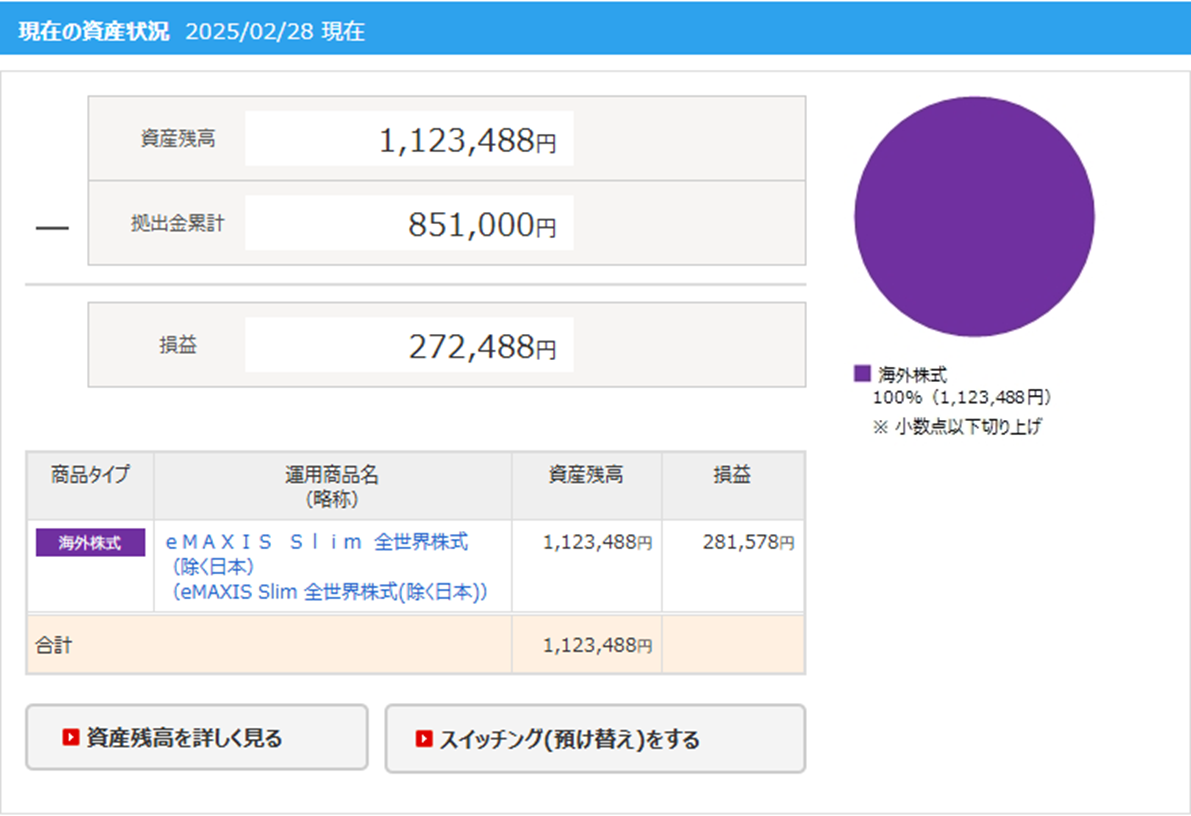 iDeCoについては、「日本を除く全世界株」を会社員の上限の月23,000円の積み立てとなります。こちらは、入れたら引き出すこともできないので、この月に1回の振り返り以外で、ほとんどログインすらせずに完全放置の状況です。