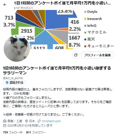 元々はポイ活だけでなく、資産運用やその他雑談について適当に綴るようなアカウントでしたが、途中どこかのタイミングでアンケートポイ活1本に絞る(時々雑談もしますが)ことにしました。