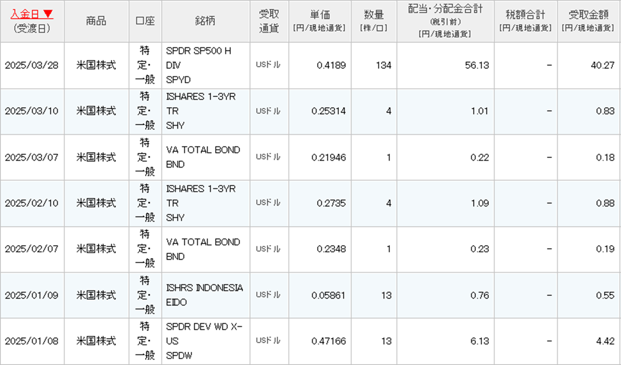 図2 各配当金(2025/1/1以降、SBI証券・米国株)