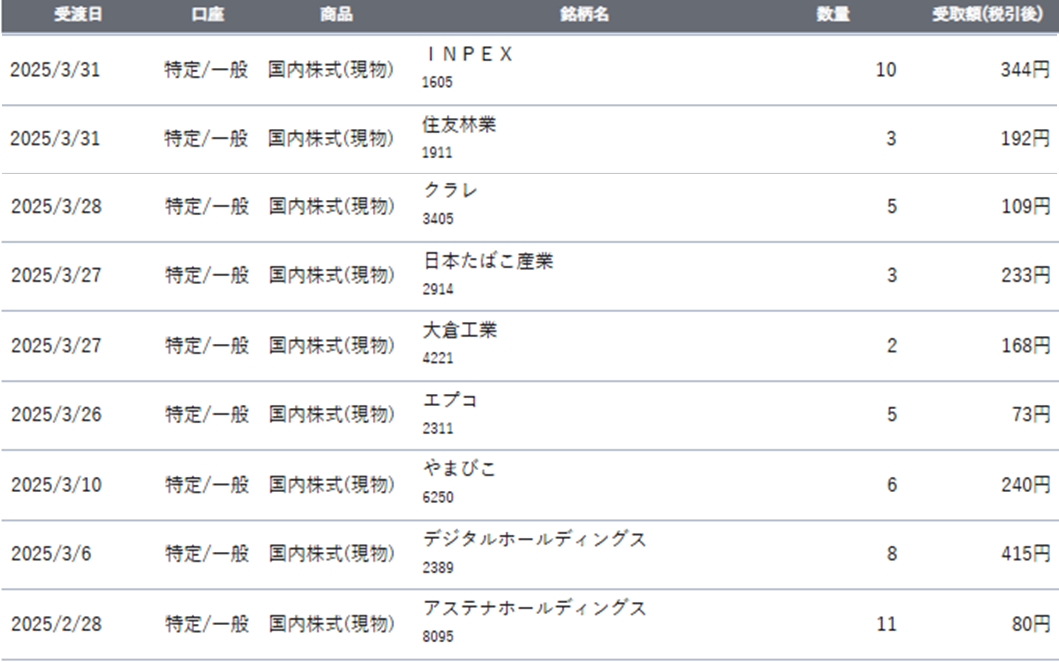 それでは早速、2025年1~3月配当の報告をまとめていきます!(一部3月配当の振り込みが翌月になっているものも含む場合があります。)