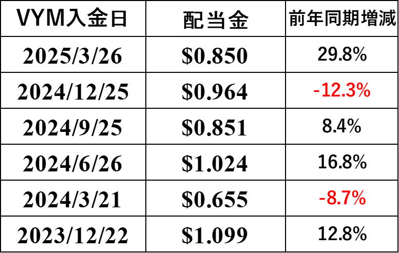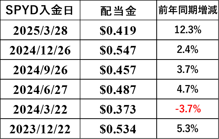 さて、前述のとおり3、6、9、12月は、私が少し多めに投資しているSPYD、VYM、HDVの配当月です。