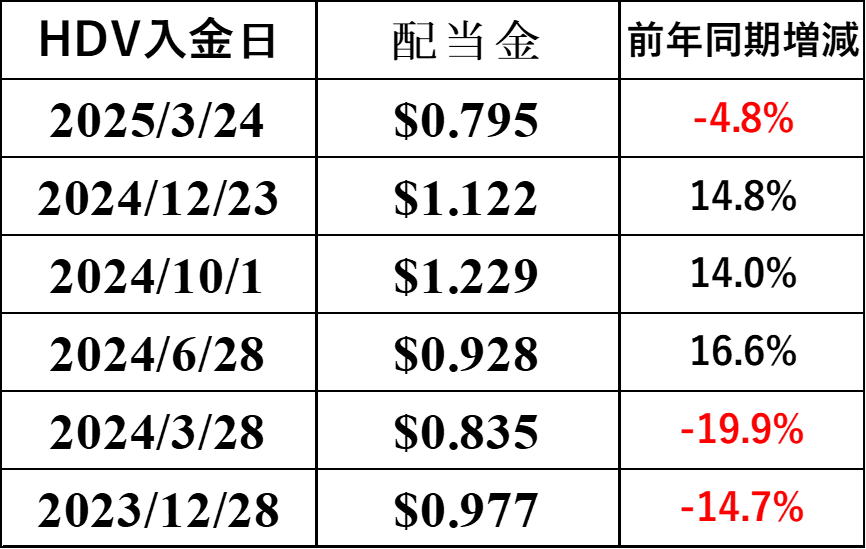 HDVは、4四半期ぶりに若干の減配ということになりました!ここ6四半期では増配と減配が半々ですね。