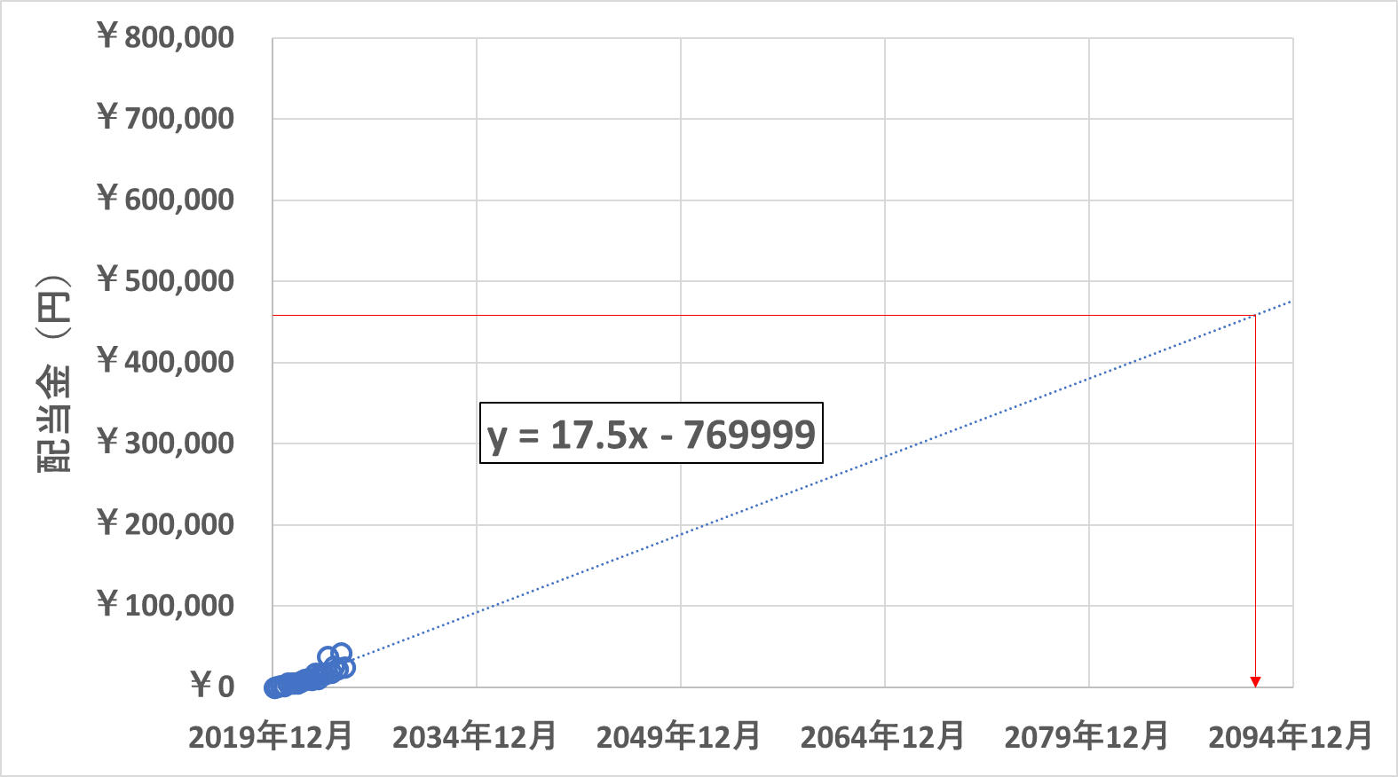 このペースで配当が増えていくと、いつになったら達成できるのか計算してみることにしました。