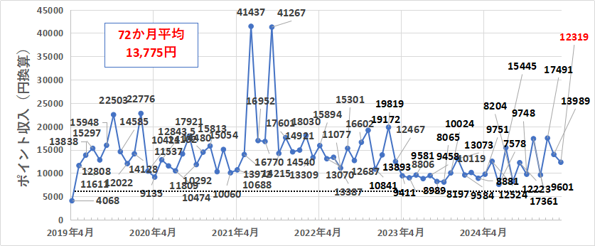 というわけで、2019年5月(月途中から始めたため参考データ)、2020年4月、2023年5~11月2024年2月、3月、5月、7月、9月、11月、2025年1月、4月以外の計54か月間において、月間10,000円分以上のポイント獲得を達成しています。