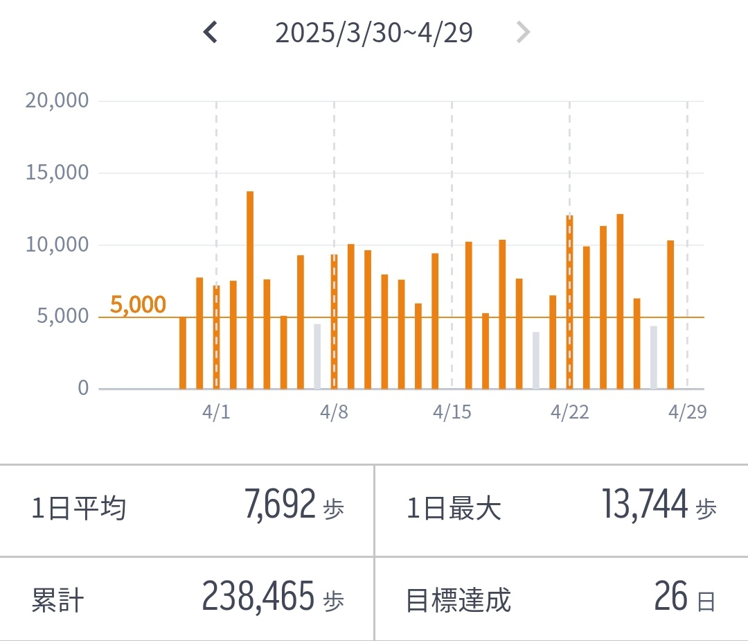 5,000歩以上の日数は26日、8,000歩以上の日数は19日でした。健康のためにも、できる限り歩数を確保できればと思っています。
