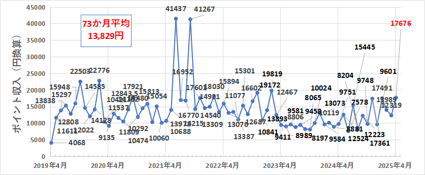 というわけで、2019年5月(月途中から始めたため参考データ)、2020年4月、2023年5~11月2024年2月、3月、5月、7月、9月、11月、2025年1月、4月以外の計55か月間において、月間10,000円分以上のポイント獲得を達成しています。