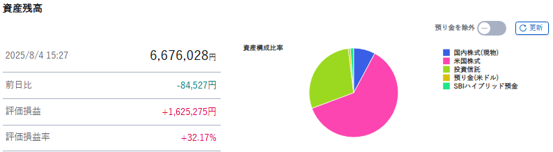 資産運用の収益:含み益&配当&実現損益(2025/8/4 15時時点)