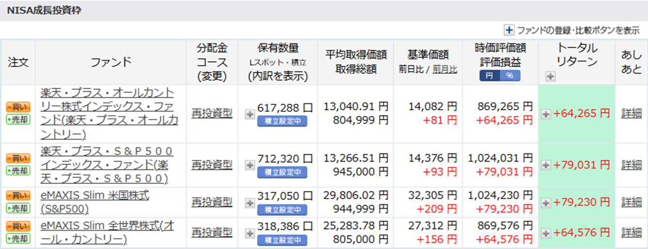 成長投資枠では、楽天プレミアムカードでの月10万円と楽天キャッシュでの月5万円の合計月15万円の積み立て設定をしています。また、これに加えて残りの枠については、価格が下がったタイミングで購入できるようにキャッシュを少し持っておき、隙を見て追加購入をしています。