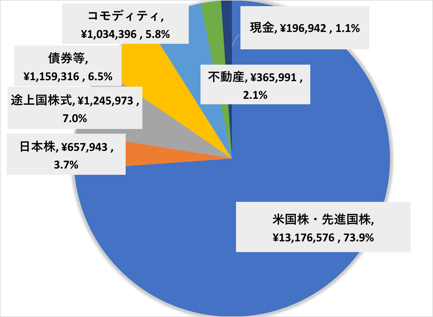 株式全体で8割を超えております。引き続きかなりリスクの高めの資産配分状況になってきました(笑)