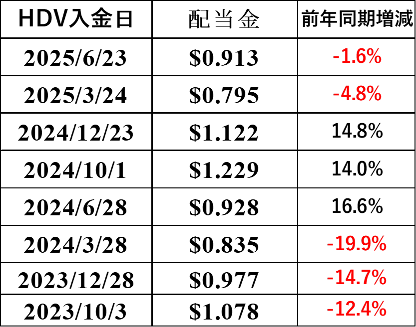 HDVは、2四半期連続で若干の減配ということになりました!ここ9四半期では増配したのは3四半期のみとあまり調子が良くないですね。