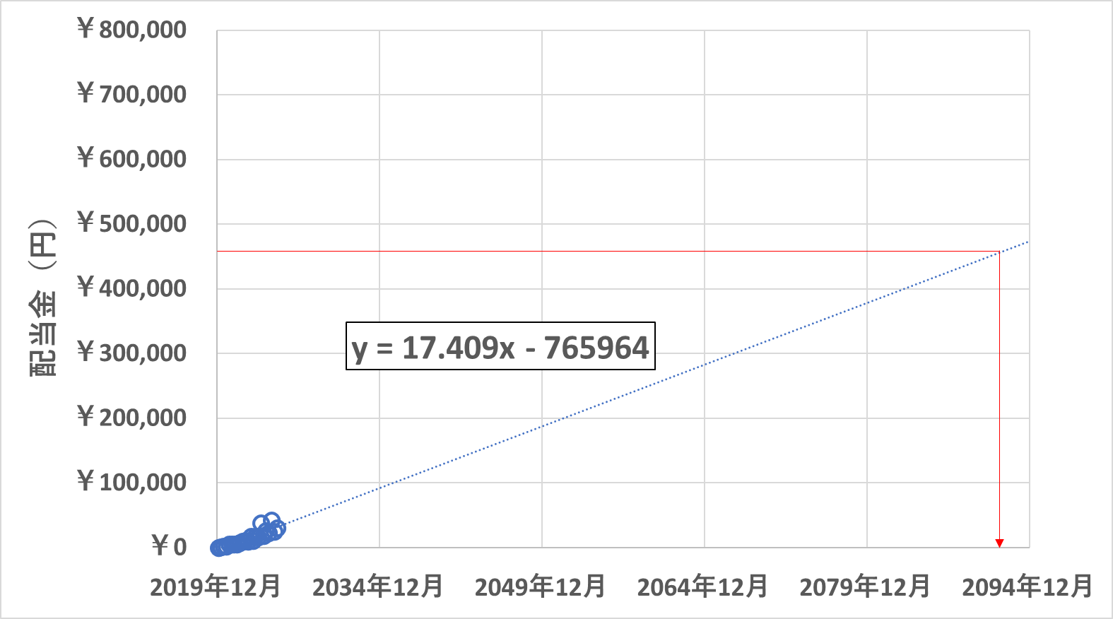 (前回3月配当の時に計算したものでは2092年3月配当だったので、今回はほぼ変わりませんでした。大分安定してきましたね。)