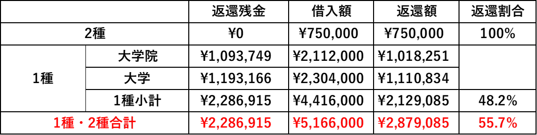 その後大学卒業まで3年間はそのままで、大学院に進学する際、1種の借り入れ金額を月8.8万円に増額しました。(合計211.2万円、右図)
