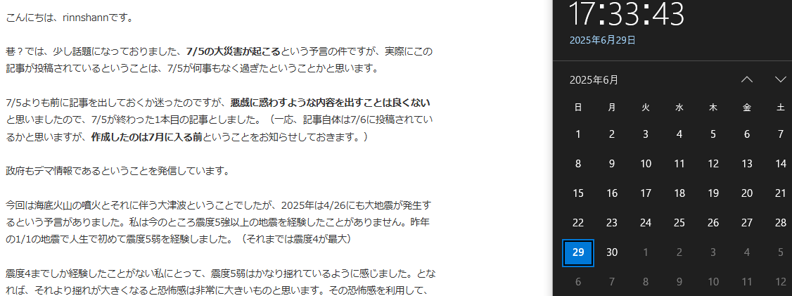 巷?では、少し話題になっておりました、7/5の大災害が起こるという予言の件ですが、実際にこの記事が投稿されているということは、7/5が何事もなく過ぎたということかと思います。