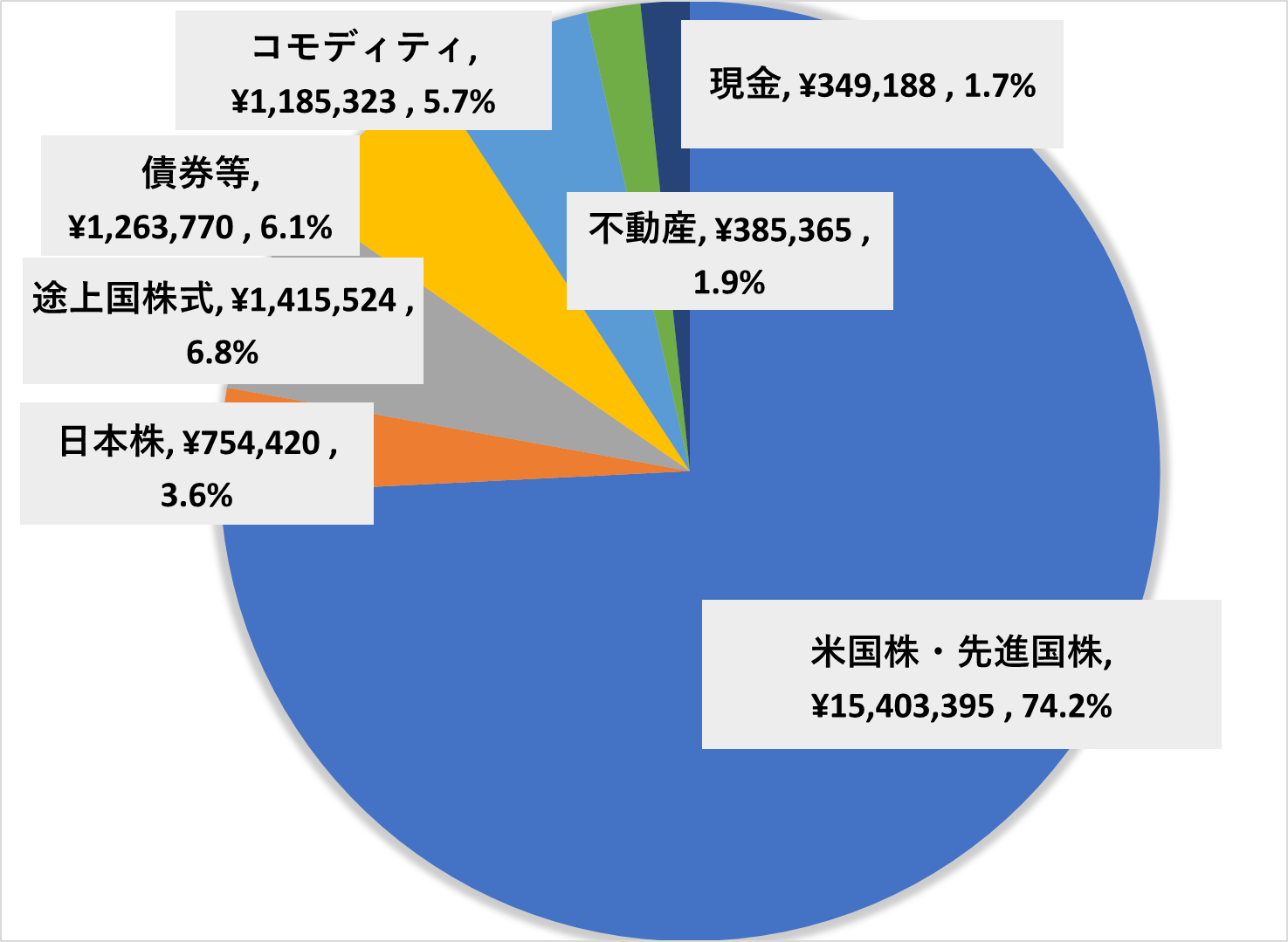コモディティについては、金、銀、プラチナ等の貴金属系のETFがかなり多くの部分を占めています。また、DBCやDBAなどにも少しずつ入れています。仮想通貨もデジタルゴールドという立ち位置で考えていて、総資産の数%を上限にコツコツ入金しています。