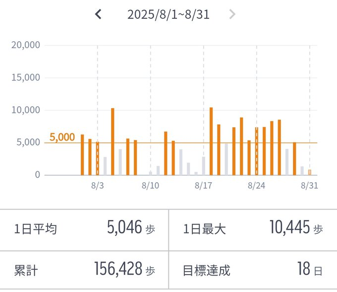 8月は特に前半に歩数が少なくなりました。これは、体調不良と快復期間、お盆の出張が重なったということです。
