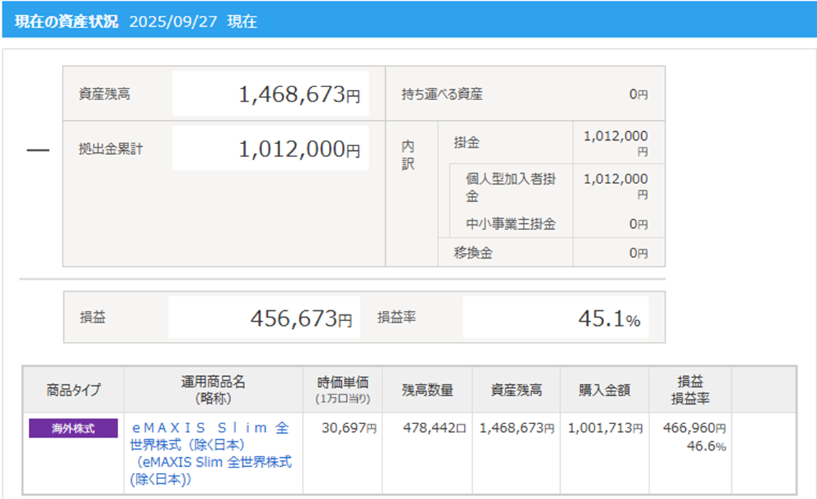 iDeCoについては、「日本を除く全世界株」を会社員の上限の月23,000円の積み立てとなります。こちらは、入れたら引き出すこともできないので、この月に1回の振り返り以外で、ほとんどログインすらせずに完全放置の状況です。