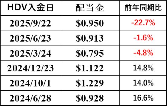 HDVは、3四半期連続で減配(今回は大きめの減配)ということになりました!ここ10四半期では増配したのは4四半期のみとあまり調子が良くないですね。
