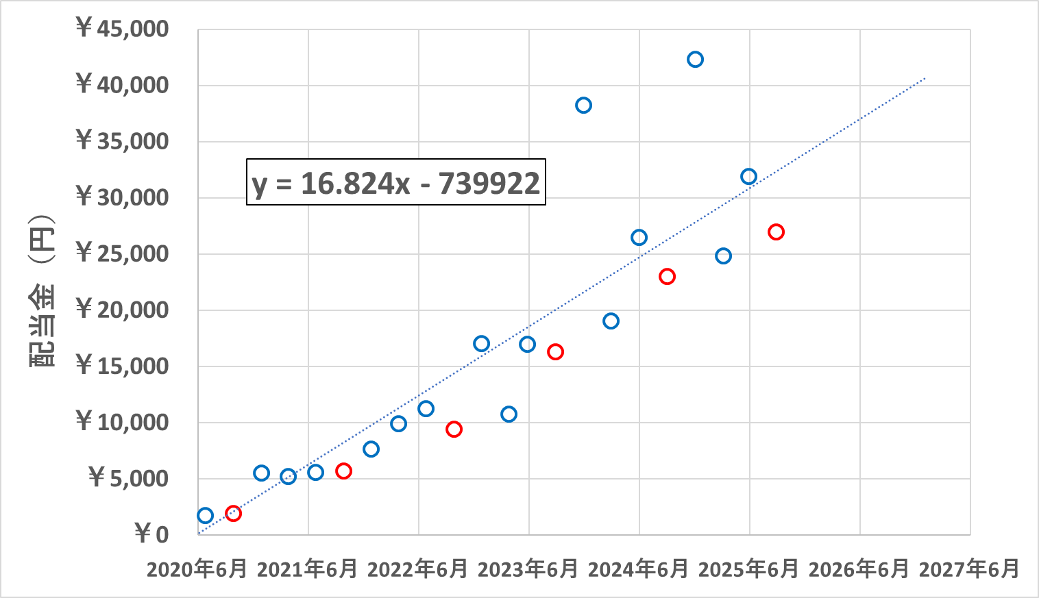 もちろん、1次関数で単純増加にはならないと思いますが、近似直線の式から計算してみると、年間配当≧年間生活費(赤直線、最新の2024年に変更後)の達成は、