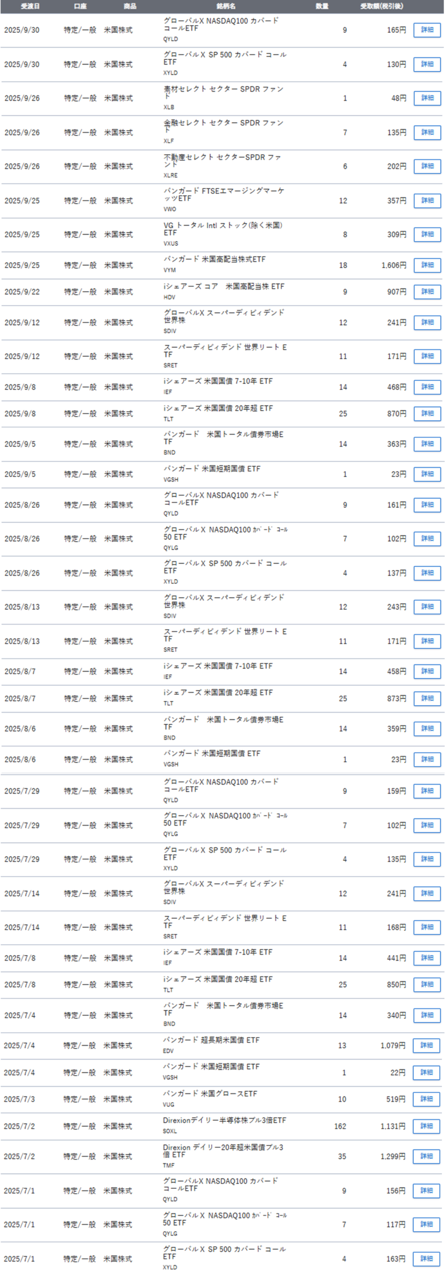 また、高配当ETF以外にも購入を進めた様々なETFや株式の配当も重なったため、2025年7月1日以降の配当の入金額の合計額についての報告にしたいと思います。(以降も同様に来年1月頭に10月~12月分といった感じで、3か月ごとに振り返りを行いたいと思っています。)