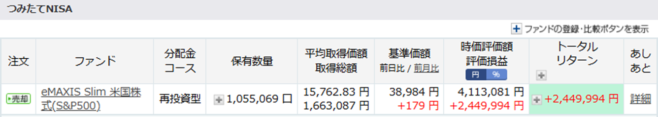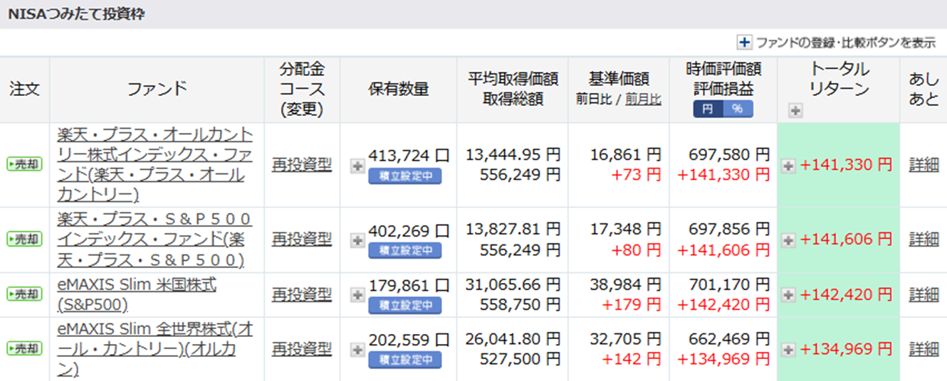 成長投資枠のトータルリターンの合計が既に100万円を突破していますね!今後も上昇しても下落してもどちらでも良いですが、私が購入するときだけ安くなってくれるとありがたいです!(笑)
