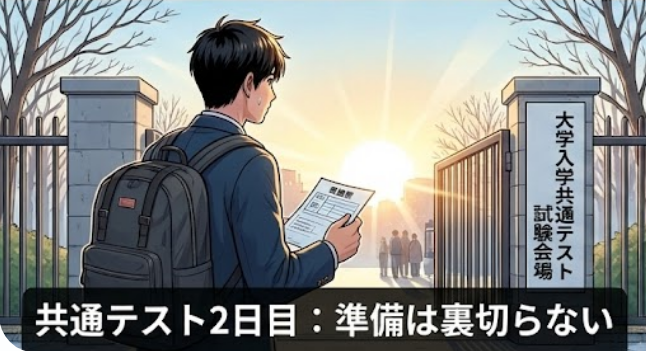 本日は、共通テスト2日目の朝、受験生の皆さんは今ごろ会場へ向かっているか、最後の公式を確認している頃でしょうか。