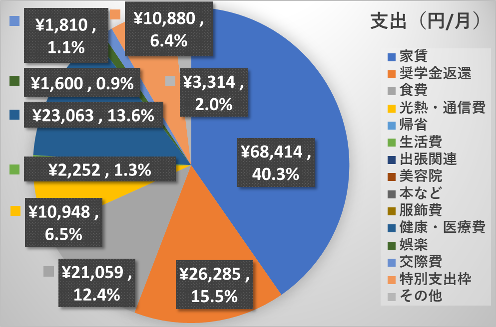 ② 支出の内訳:合計 169,625円(手取り比 64.1%)