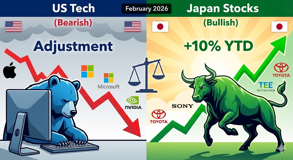 2026年2月、米国大型ハイテク株が調整に入る一方で日本株は年初から10%前後の上昇。筆者は「下がったらラッキー」の精神で、新NISAの成長投資枠を埋めるべく買い増しを継続。
